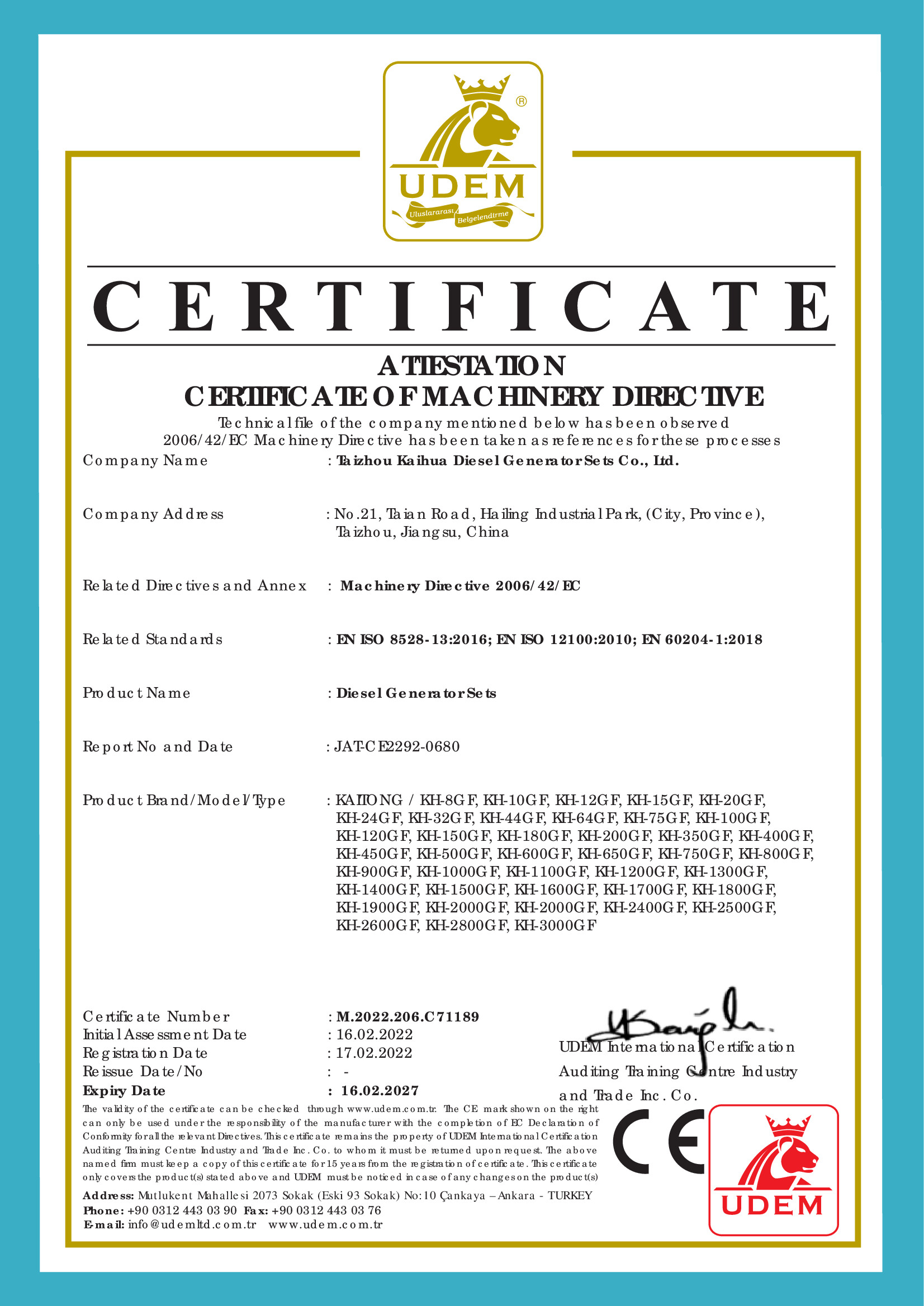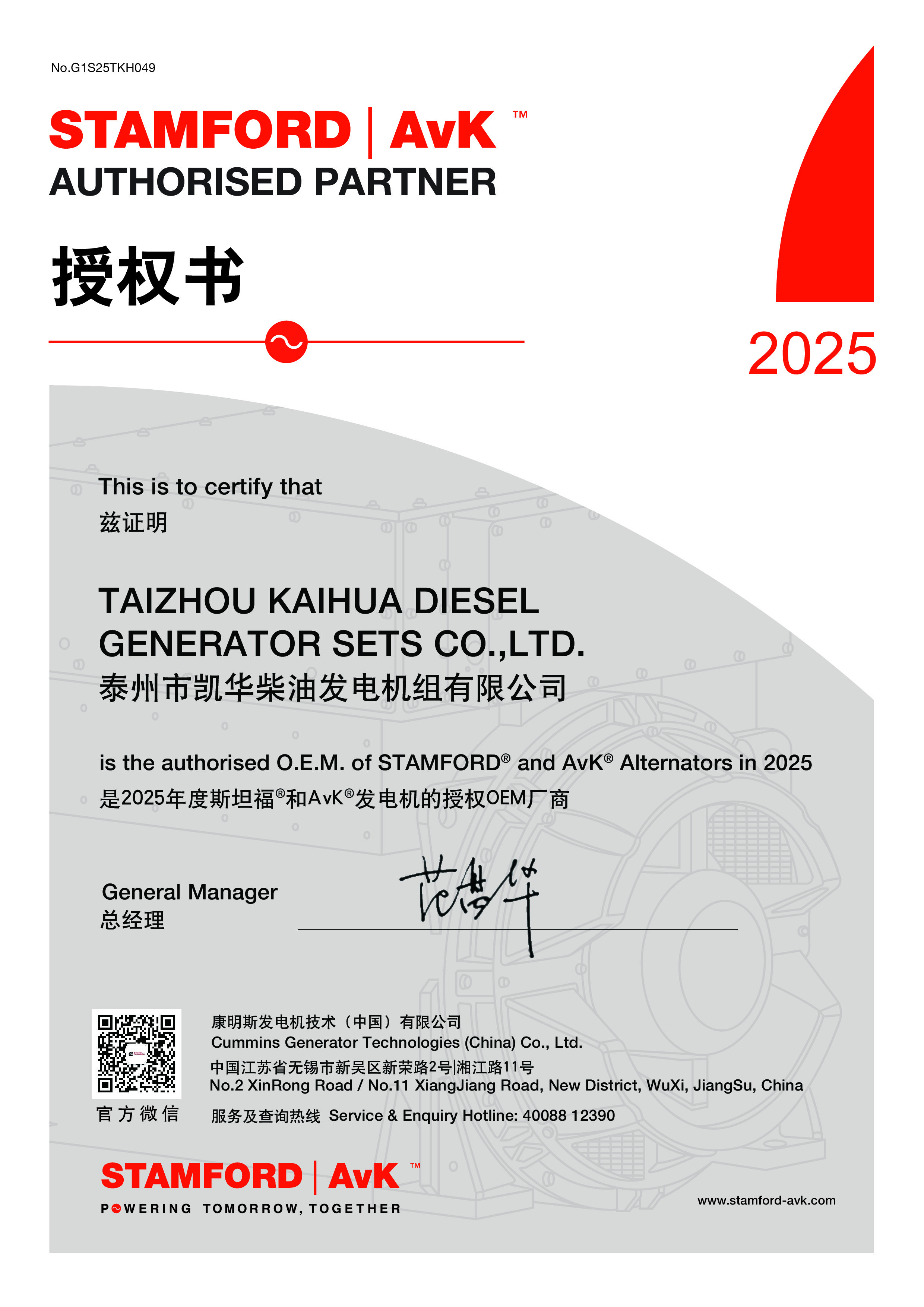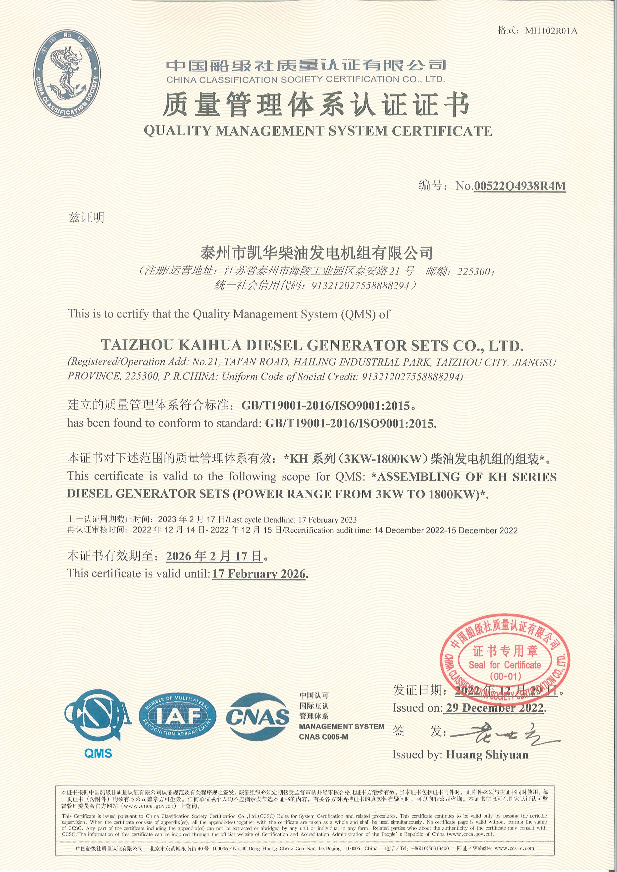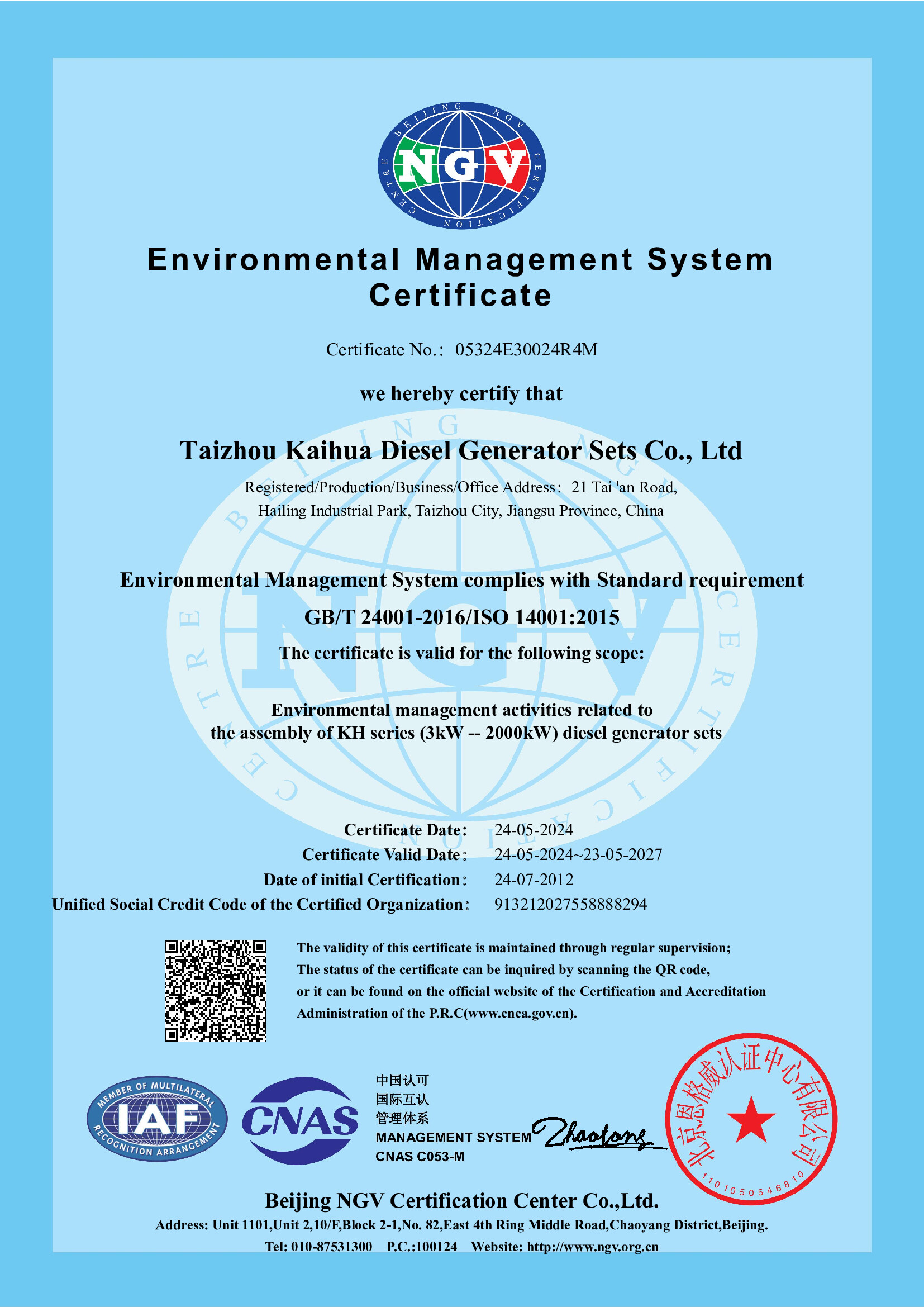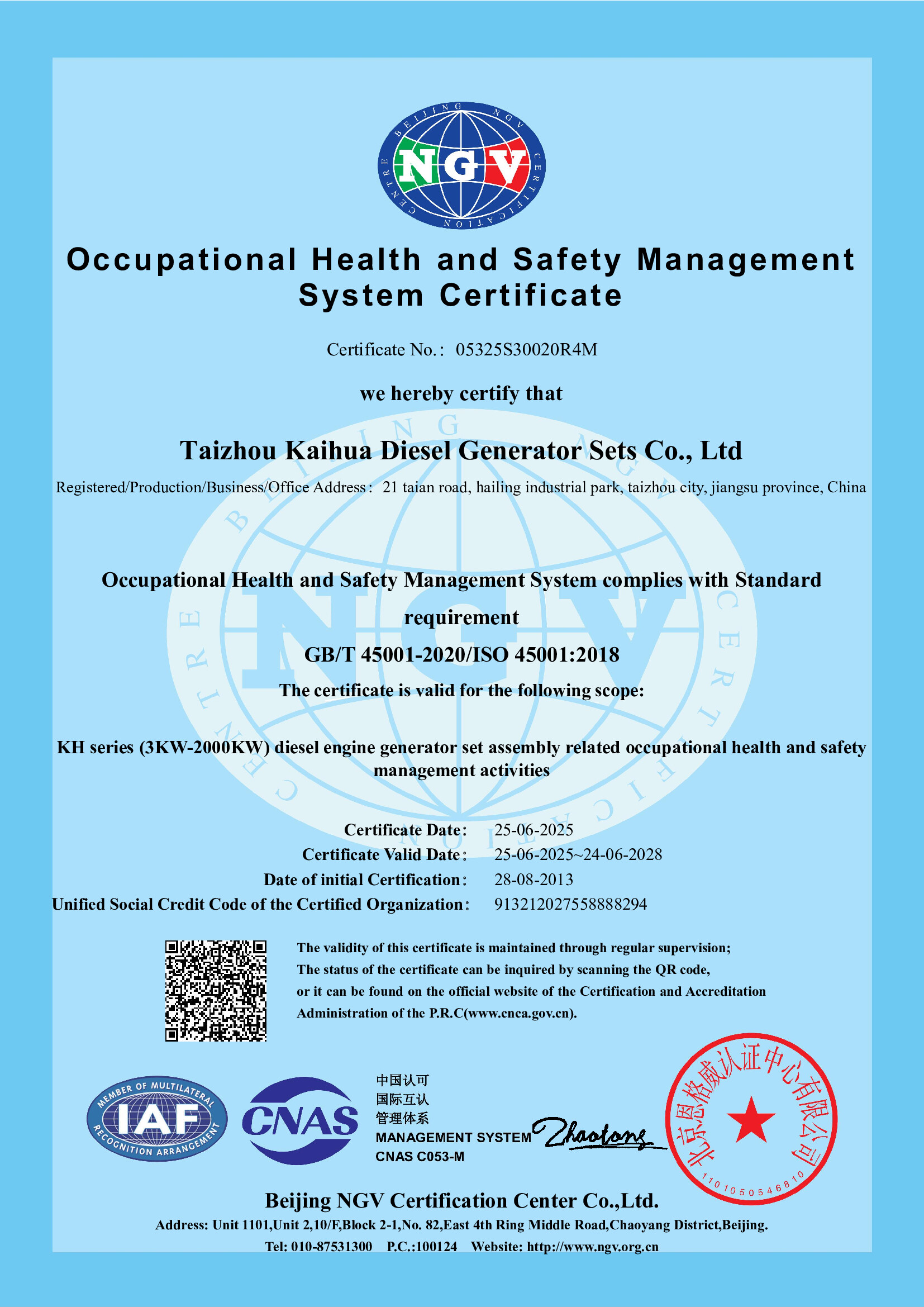 Taizhou Kaihua Diesel Generator Sets Co., Ltd. was established in 2003 and is located in Taizhou City, Jiangsu Province. With 22 years of manufacturing experience, the company has an annual production capacity of over 3,000 units. As a high-tech enterprise specializing in the production of generator sets, Kaihua's products have undergone rigorous technical verification and have obtained ISO9001-2015 quality management system certification, as well as several other certifications, including CE, TLC, CCS, and BV.